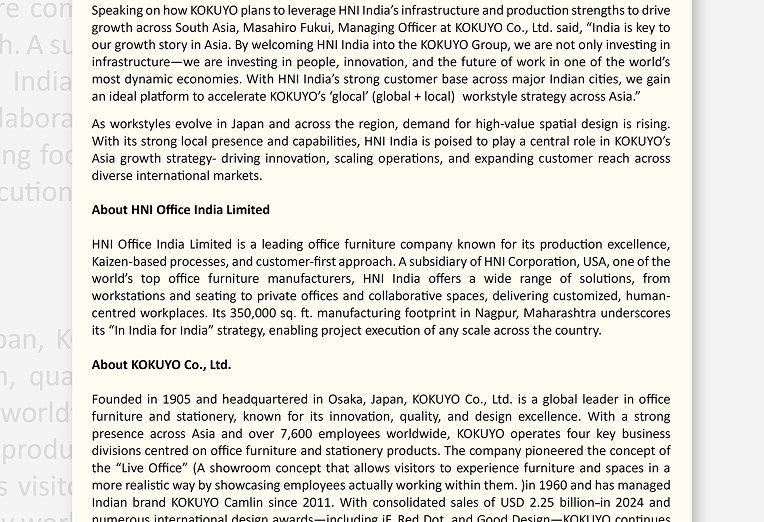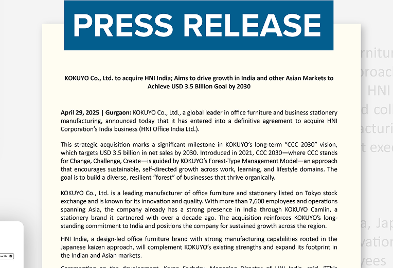 KOKUYO Co., Ltd., a leading Japanese enterprise engaged in office furniture and stationery business, today announced the execution of a binding agreement to acquire the India businesses of HNI Corporation, operating under the brand name of HNI Office India.
