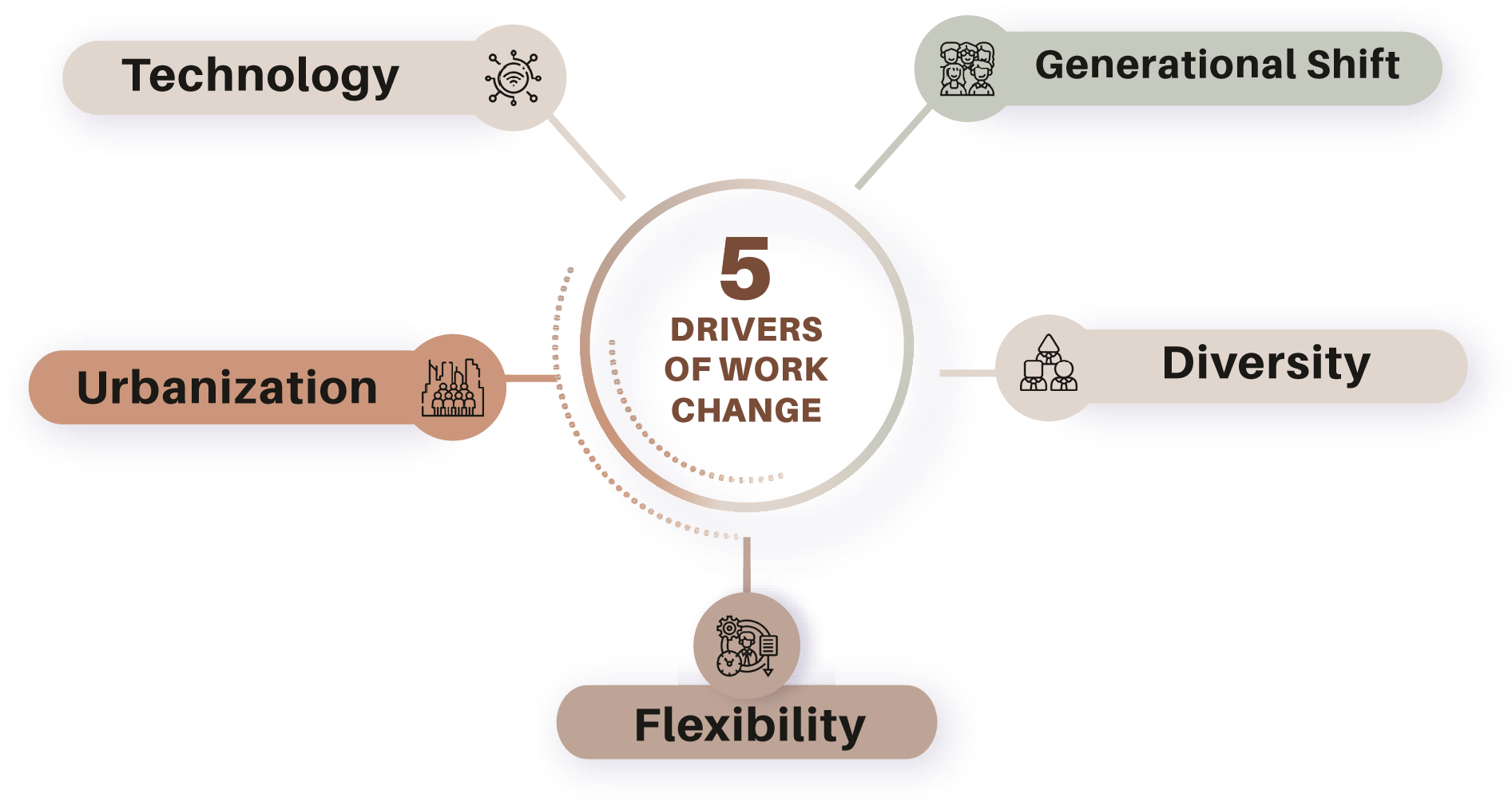 So, what does this all mean? The five drivers identified above are impacting work and the workforce in a few areas we weren’t necessarily expecting: