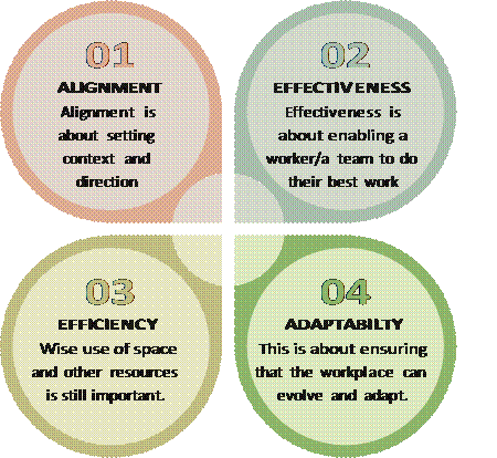 Workplace Strategy is powerful and takes a holistic look: to see each organization as a unique and an interdependent eco-system of activities that is constantly adapting over time. The end result is a strategy that echoes this dynamic: a workplace that “fits” now and can also easily evolve over time. As we say in our [whitepaper], “Workplace strategy involves creating an ecosystem of spatial and behavioral norms designed specifically to support key business processes and organizational management practices—which in turn help organizations achieve their business goals” As complicated as that may sound, we’ve figured out over time that the best workplace strategies consider four key (and highly interdependent) areas: Alignment, Effectiveness, Efficiency and Adaptability.