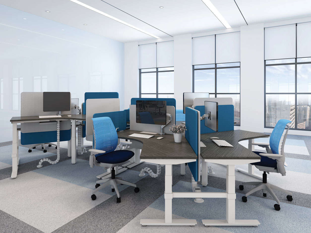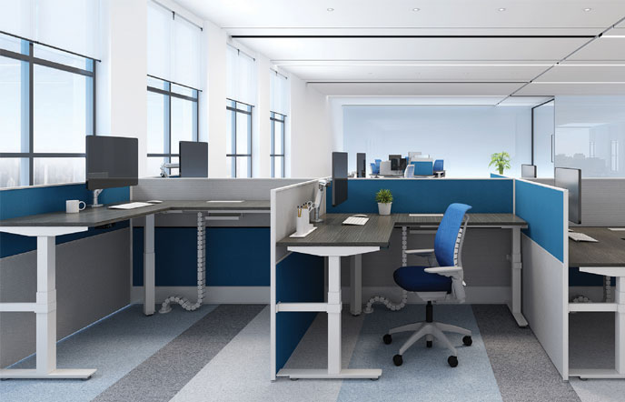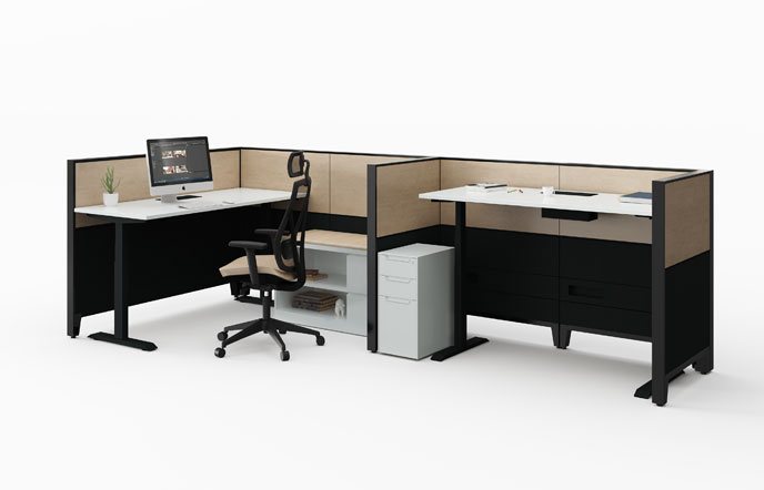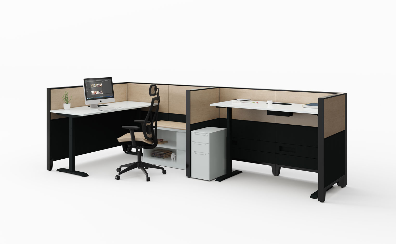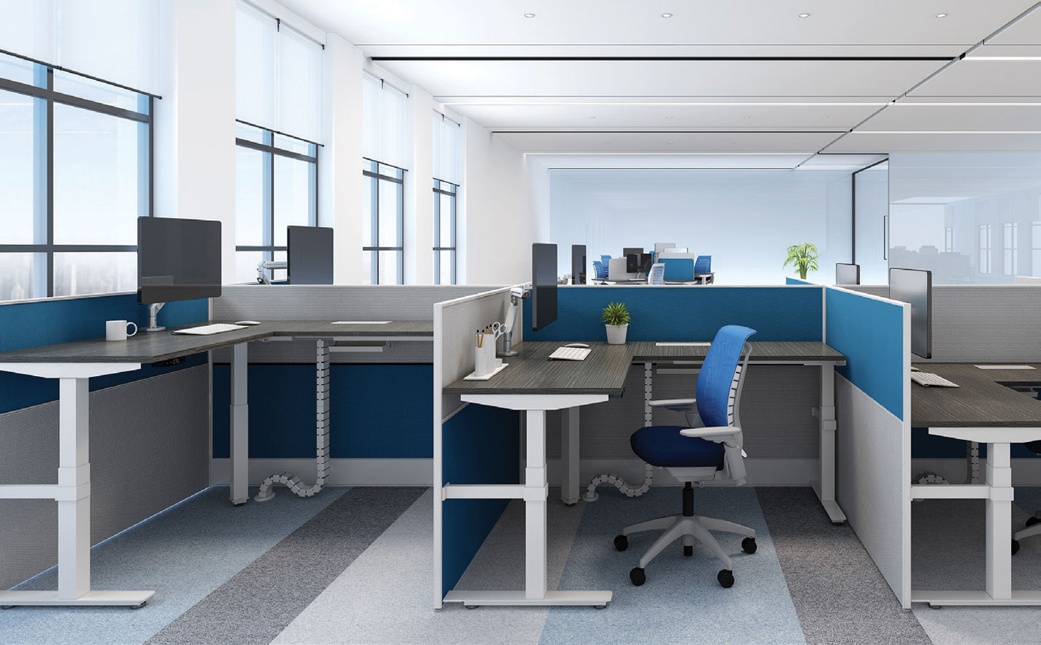 The Avail HAT supports various working styles and positions, enabling both sitting and standing heights. Available in different configurations, including L-shape, 120-degree styles, and integrated versions with all Avail panels, it fits every layout and plan.