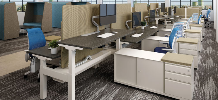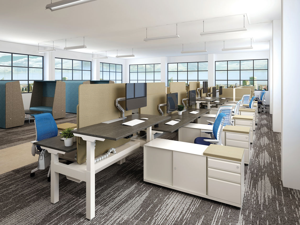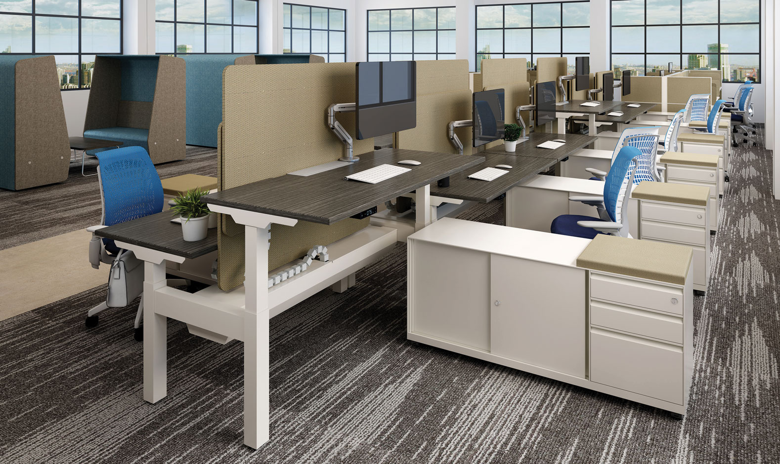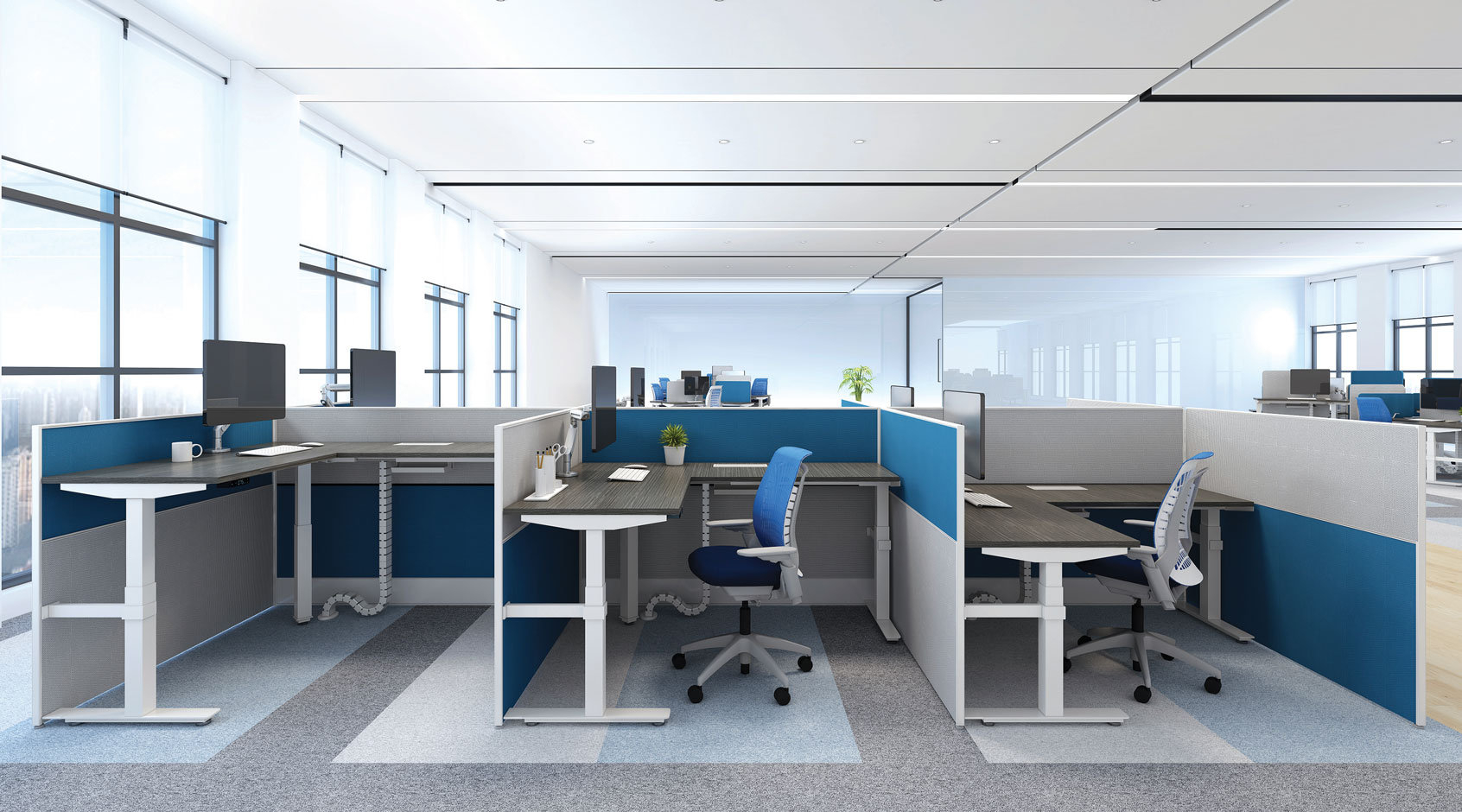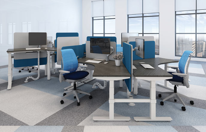 The Avail HAT supports various working styles and positions, enabling both sitting and standing heights. Available in different configurations, including L-shape, 120-degree styles, and integrated versions with all Avail panels, it fits every layout and plan.